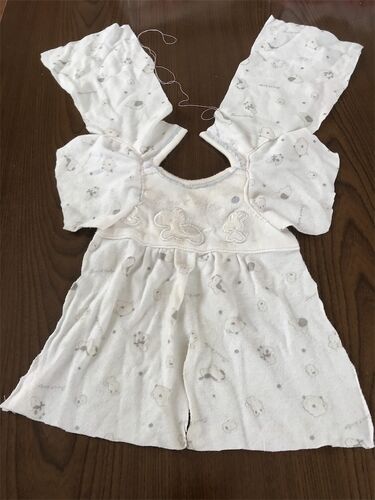 材料は50-70ベビードレス 鉄剤を飲ませていた時期の服には落ちないシミがある。足首にゴムを入れたいので 型紙の脇の下を支点にくるぶしのところを+2cmした袖を別パーツにするととても時間がかかる ズレないようにマチ針を刺すところから苦戦してた