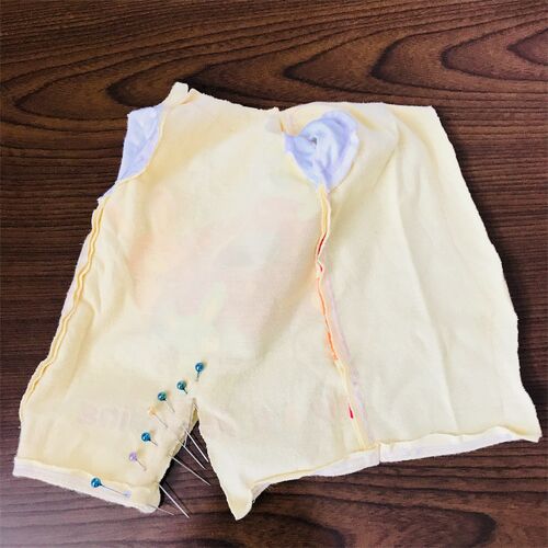 袖口を縫い終わったら 左右の合わせが被さる向きが合っているか 確認してからズボンの部分にまち針