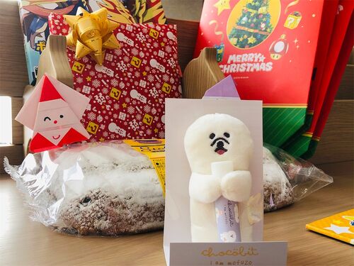 おはようございます⛄️ 私にもクリスマスプレゼントが届いていて朝から笑っちゃいました リップクリームを抱えたMOFUZOUさん 足があるのでアザラシではなく間違いなく犬ちゃん