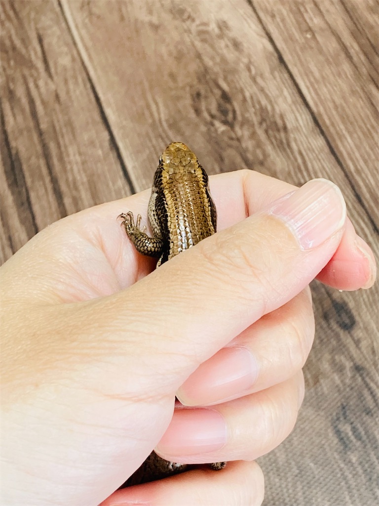 2022-05-13 トカゲの日常 握られるヒガシニホントカゲのぺろみちゃん トカゲは変温動物だから散歩中に冷えてしまうことがある 冷えてきたら手の中で温まって元気が出てきたらまた散歩 いつもそれを繰り返してる 名前を呼ぶと来る 別に冷えてなくてもあっちに見たことないのあった!とばかりに戻ってくることもある