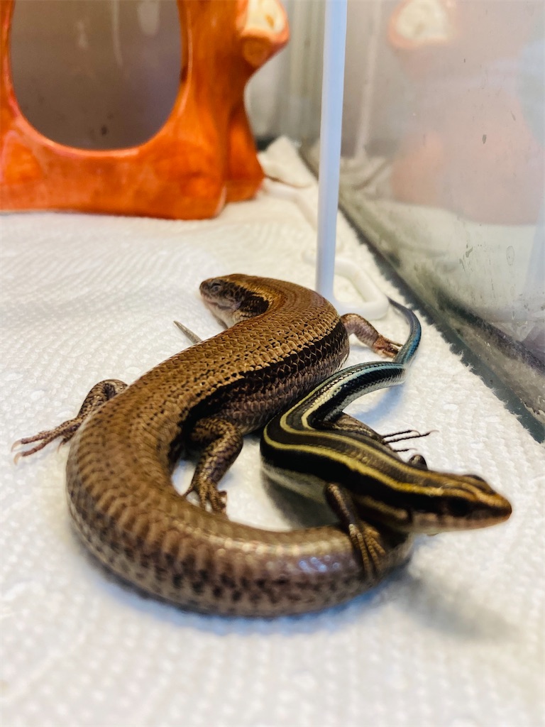 2022-09-25 トカゲは多頭飼育でも平気なのか? ヒガシニホントカゲのぺろみちゃんは家に来て約2年ちびちゃんは4ヶ月くらいだったかな ものすごい体格差だ 手に乗せた時の重みが全然違う トカゲって何故か集まってトカゲ団子になって複数匹一緒にいる事が多い トカゲって大きな括りで、カナヘビはカナヘビだけーみたいな細かい分類まではされていないみたい。 小さいちびちゃんも仲間に入れてもらっている 今のところ食べ物ではなく1トカゲとして認識して貰えている